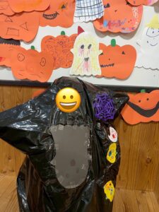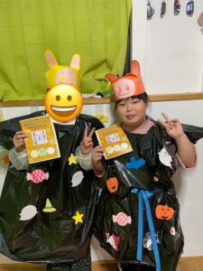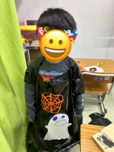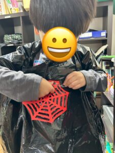 袋を切ったり、画用紙の飾りを貼り付けたり、素敵な仮装ができました👻