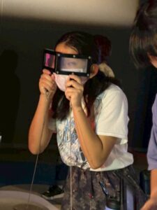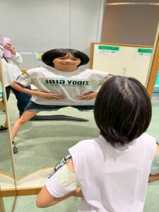 不思議な鏡をみて「おもしろ~い」と大はしゃぎ